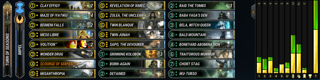 An enchantment based control deck, Angel Loop looks to fill the board with useful enchantments to push into the late game and then cycle their creatures using Root of the World for advantage. The early game of Angel Loop provides the more varied aspects but due to the Beimeni Falls it has become a strong late game contender after it stabilizes versus aggro or midrange decks. It can go about even with the RO Aggros and Midranges as well as even with YO. It still struggles versus extremely fast decks or anything that provides a lot of overrun as the snakes do most of the blocking and against YG control, as their ability to burst from hand and apply pressure seems to be a bit more elevated than loop. It may see less play on ladder due to the 3 color combination and the ease of misplays, it’s a deck that takes practice to pilot consistently. – Ejecty