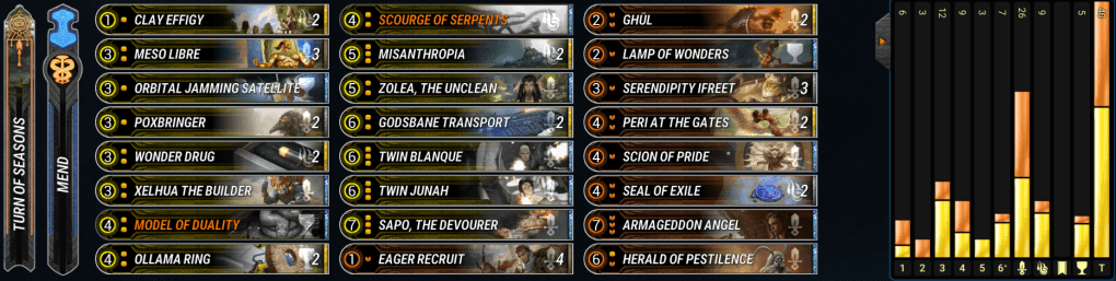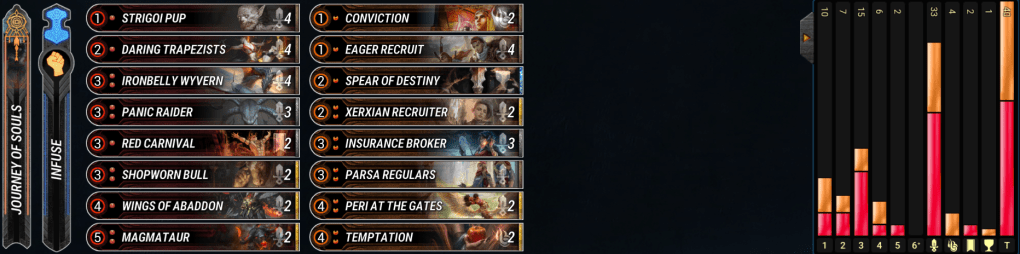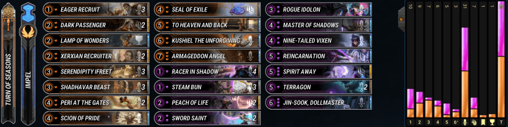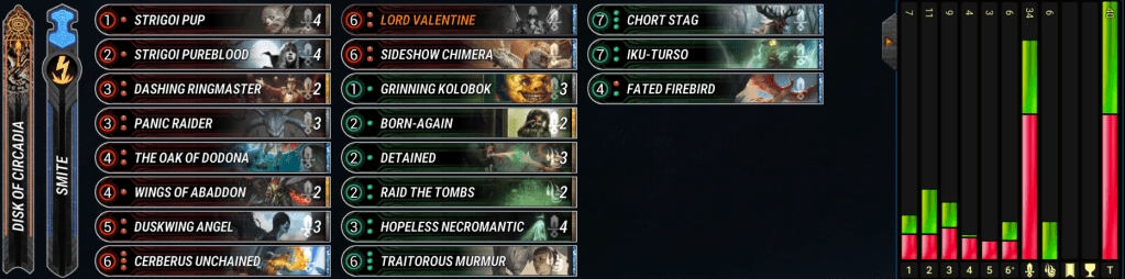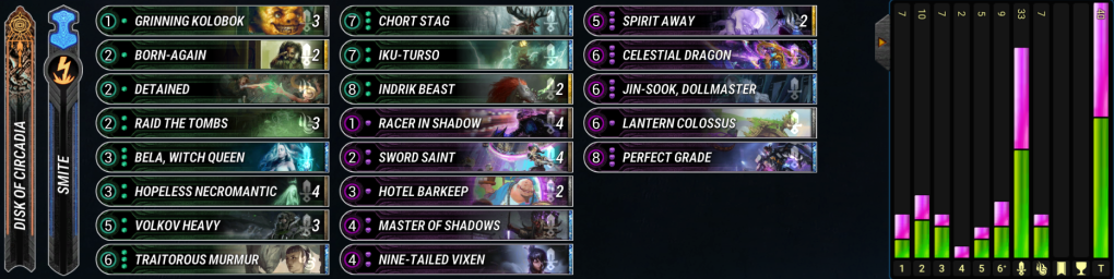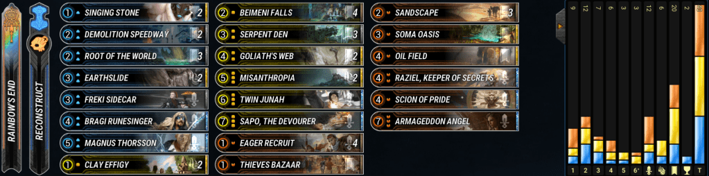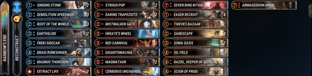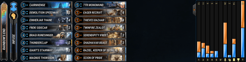 Valks have been steady in the metagame for a long time. This version opts to use Rainbow’s End and Impel to move around our big overstated minions. Mono-Blue dips us into Bridgeway troll so we can have even more free move actions to abuse our best enchantments on board. Valks are still pretty vulnerable to stabilization from Misanthropia and Armageddon Angel which are prominent in the best decks right now. The deck falls short to the other aggro decks in that must use to Freki Sidecar to pressure after board clears, but the archetype is solid enough in the early game that the downside isn’t too bad. – Oneiric