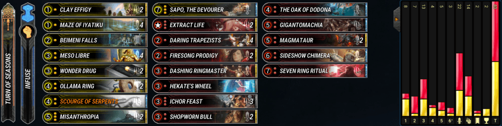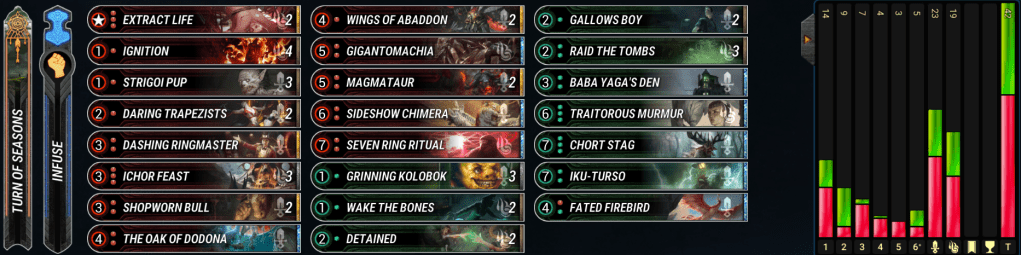 RG Control is one of the weirder decks to play and pilot. It plays the best draw spells in the game in Ichor Feast and Raid the Tombs to have some of the better hand tempo in the game for a Turn of Seasons deck. It’s optimized with having cheap cards, like Strigoi Pup and Ignition to play in combination with those cards. The deck plays for board heavily with defensive spells and rush minions early, so you can get into the late game to gas them out with big Dreni/Green minions. There is also the Ringmaster Seven Ring Ritual combo looming if you can burn up to it to end games against YG and YO control decks. RG has a problem with Necromantic decks with only a few options against it as well as Master of Shadows and opposing Seven Ring Rituals. It’s important to continually fight for board and pressure the opponent so those cards don’t blow you out. – Oneiric